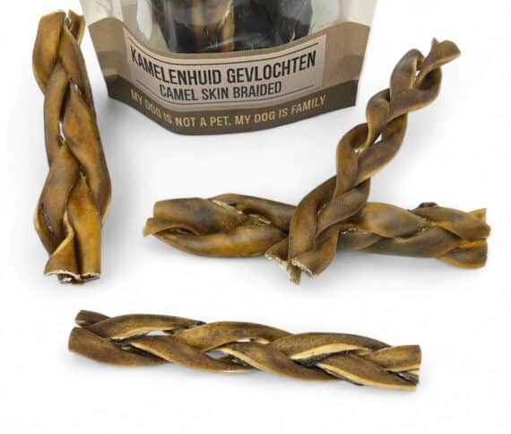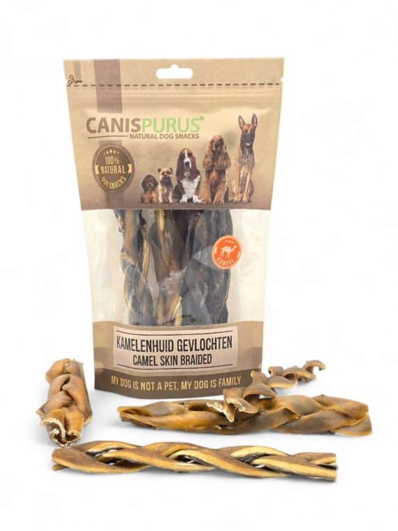 Canis Purus Kameelhuid – Gevlochten is een taaie snack gemaakt van lange smalle lapjes kamelenhuid. Kameel wordt vaak ingezet als hypoallergene kauwsnack bij honden met allergiën/intoleranties.