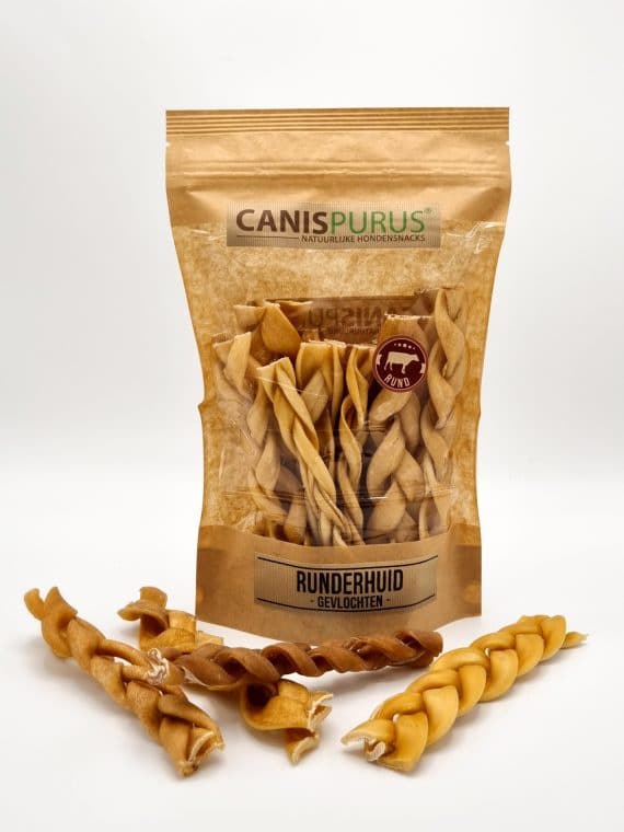 Deze gevlochten runderkophuid snack is een taaie hondensnack en is op lage temperaturen gedroogd. Doordat honden hier wat langer op kauwen zorgt het ervoor dat het gebit gereinigd wordt.