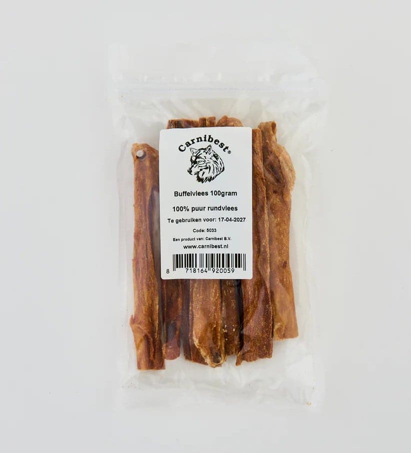 100 % gedroogd buffelvlees, lekker als tussendoortje.