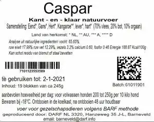 Darf is een KVV gemaakt door de eigenaren van slagerij de Groene Weg in Amersfoort. Darf is opgebouwd uit eerlijke grondstoffen, afkomstig uit gecontroleerde landbouw geschikt voor menselijke consumptie. Doordat er 4 diersoorten zijn verwerkt in deze Natuur versie is het compleet, toch raden we aan om af te wisselen in soorten en 1 maal in de week een visvariant. Darf heeft een maling van 9 mm, muv de puppy. De Darf Casper is vrij van kip, rund en granen.