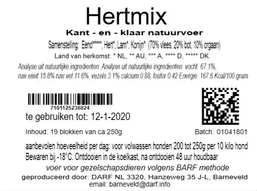 Darf is een KVV gemaakt door de eigenaren van slagerij de Groene Weg in Amersfoort. Darf is opgebouwd uit eerlijke grondstoffen, afkomstig uit gecontroleerde biologische landbouw geschikt voor menselijke consumptie. Doordat er 4 diersoorten zijn verwerkt in deze Hertmix versie is het compleet, toch raden we aan om af te wisselen in soorten en 1 maal in de week een visvariant. Darf heeft een maling van 9 mm, muv de puppy.