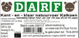 Darf is een KVV gemaakt door de eigenaren van slagerij de Groene Weg in Amersfoort. Darf is opgebouwd uit eerlijke grondstoffen, afkomstig uit gecontroleerde landbouw geschikt voor menselijke consumptie. Doordat er 4 diersoorten zijn verwerkt in deze Kalkoen versie is het compleet, toch raden we aan om af te wisselen in soorten en 1 maal in de week een visvariant. Darf heeft een maling van 9 mm, muv de puppy.