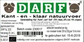 Darf is een KVV gemaakt door de eigenaren van slagerij de Groene Weg in Amersfoort. Darf is opgebouwd uit eerlijke grondstoffen, afkomstig uit gecontroleerde landbouw geschikt voor menselijke consumptie. Doordat er 4 diersoorten zijn verwerkt in deze Natuur versie is het compleet, toch raden we aan om af te wisselen in soorten en 1 maal in de week een visvariant. Darf heeft een maling van 9 mm, muv de puppy.