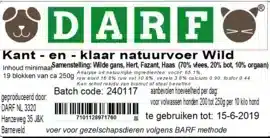 Darf is een KVV gemaakt door de eigenaren van slagerij de Groene Weg in Amersfoort. Darf is opgebouwd uit eerlijke grondstoffen, afkomstig uit gecontroleerde landbouw geschikt voor menselijke consumptie. Doordat er 4 diersoorten zijn verwerkt in deze wild versie is het compleet, toch raden we aan om af te wisselen in soorten en 1 maal in de week een visvariant. Darf heeft een maling van 9 mm, muv de puppy.