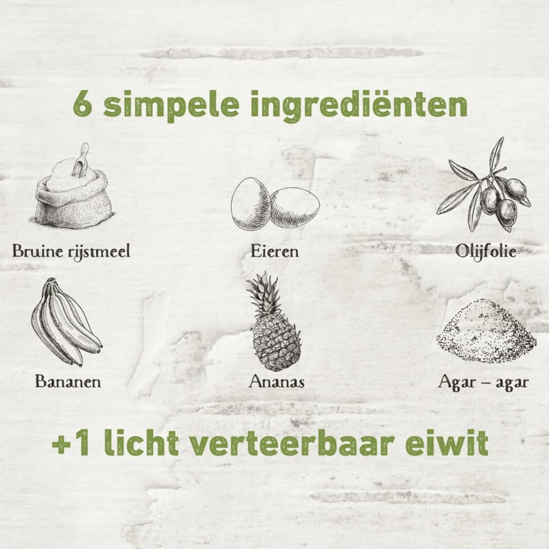 Ingrediënten: Scharrelkip (48%), bruine rijstmeel, eieren, olijfolie, bananenpoeder, ananas stengel, agar-agar (plantaardige gelatine) 0,29mg/kg