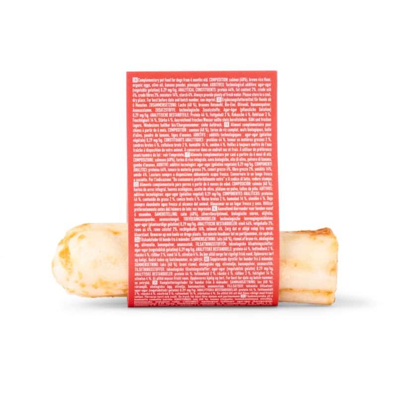 Ingrediënten: Wild gevangen Zalm (48%), bruine rijstmeel, eieren, olijfolie, bananenpoeder, ananas stengel, agar-agar (plantaardige gelatine) 0,29mg/kg