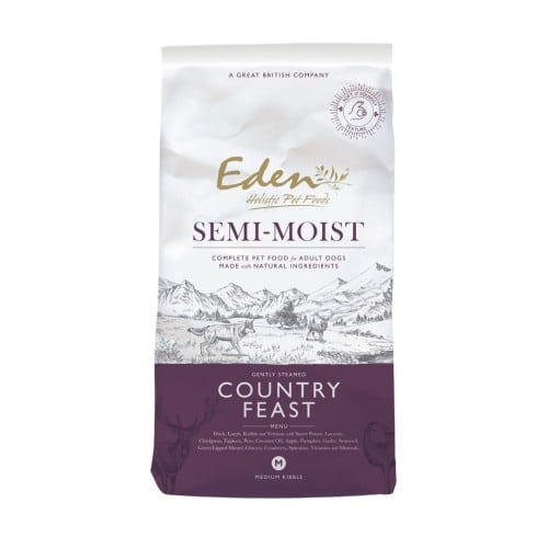 Semi-Moist Country Feast is een zachte en malse voeding met 60% vlees en 40% groenten en fruit. Door het speciale productieproces en de toevoeging van natuurlijke plantaardige glycerine bevat deze voeding ongeveer dubbel zoveel vocht als een normale krokante brok. Semi-Moist Country Feast bevat vers bereide eend, lam, konijn en hert van Britse herkomst.