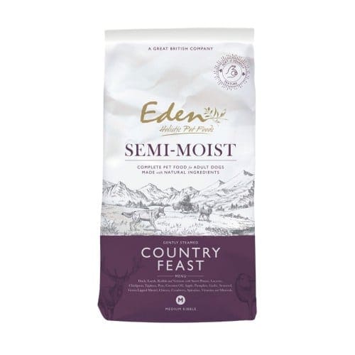 Semi-Moist Country Feast is een zachte en malse voeding met 60% vlees en 40% groenten en fruit. Door het speciale productieproces en de toevoeging van natuurlijke plantaardige glycerine bevat deze voeding ongeveer dubbel zoveel vocht als een normale krokante brok. Semi-Moist Country Feast bevat vers bereide eend, lam, konijn en hert van Britse herkomst.