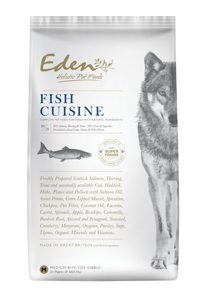 Een graanvrije voeding voor honden uit Groot-Brittanië met 80% vis en 20% groenten en fuit. Eden Fish Cuisine is een uitgebalanceerde voeding voor uw hond met een hoog visgehalte. De voeding is volledig vrij van graan, gluten en witte aardappel. De Fish Cuisine is ook uitermate geschikt voor honden die allergisch zijn voor kip. Deze soort bevat de “Super Foods” kokosolie, spirulina en groenlipmossel.