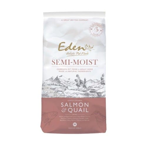 Semi-Moist Salmon & Quail is een zachte en malse voeding met 60% vlees en 40% groenten en fruit. Door het speciale productieproces en de toevoeging van natuurlijke plantaardige glycerine bevat deze voeding ongeveer dubbel zoveel vocht als een normale krokante brok. Semi-Moist Salmon & Quail bevat zalm, kwartel, varken en wild.