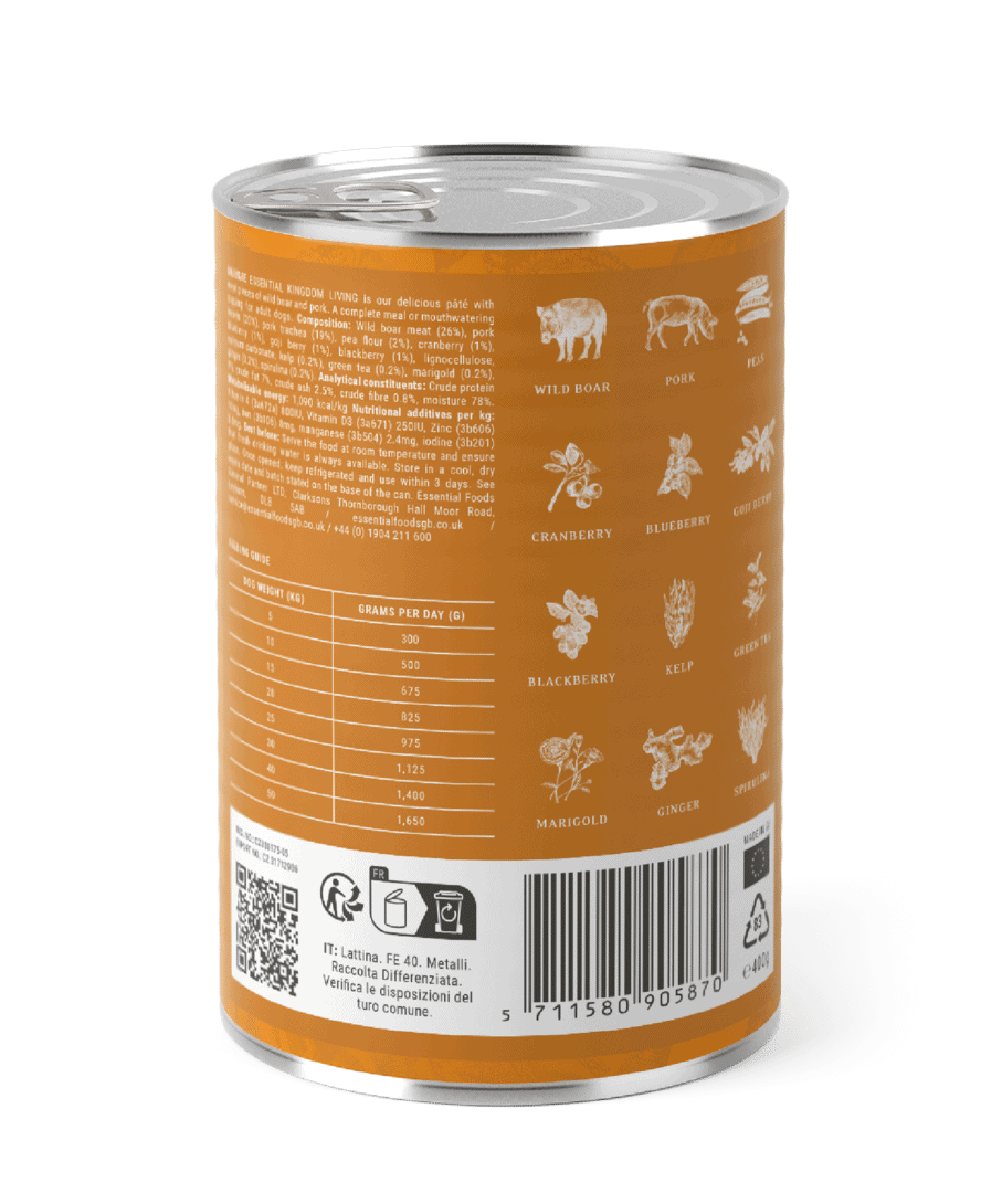 Essential Foods Kingdom Living blikvoeding is een heerlijke paté met stukje swild zwijn en varkensvlees voor volwassen honden. Het kan worden geserveerd als een complete maaltijd, maar smaakt net zo goed als een overheerlijke topping over de brokken. Het is graanvrij, uitsluitend op basis van wild zwijn en varkensvlees en gemaakt met uitsluitend natuurlijke ingrediënten.