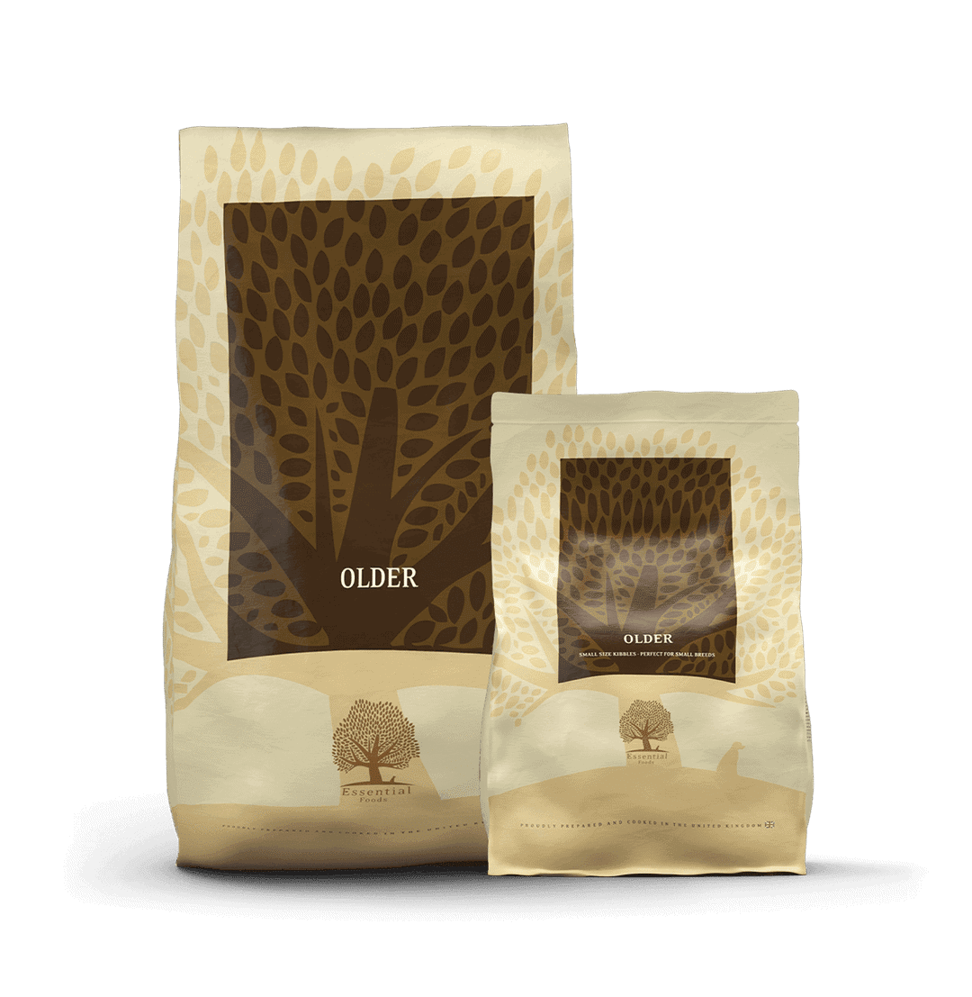 Essential Foods Older is een volledige maaltijd die speciaal voor oudere honden is ontwikkeld. Essential Foods older is een unieke graanvrije maaltijd met 78% verse en gedroogde scharrelkip en vrij lopende eenden, verantwoord gekweekte zalm en Salisbury regenboogforel en ei. Hiervan is 45% vers vlees en verse eieren (als % van het totale recept). Aangevuld met 22% groenten, zaden, kruiden, bessen, fruit, vitaminen en mineralen.