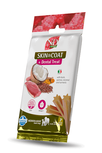 Dental Treat Skin & Coat Eend is aanvullende voeding voor honden ouder dan 4 maanden, gewoon een lekkere hypoallergene kauwsnack voor tussendoor. De dental treats zijn specifiek geschikt voor honden met voedselallergieën. De dental treats zijn graanvrij, bevatten 1 dierlijke eiwitbron (eend) en zijn verrijkt met omega-3 en kokos om de huid en vacht te ondersteunen.