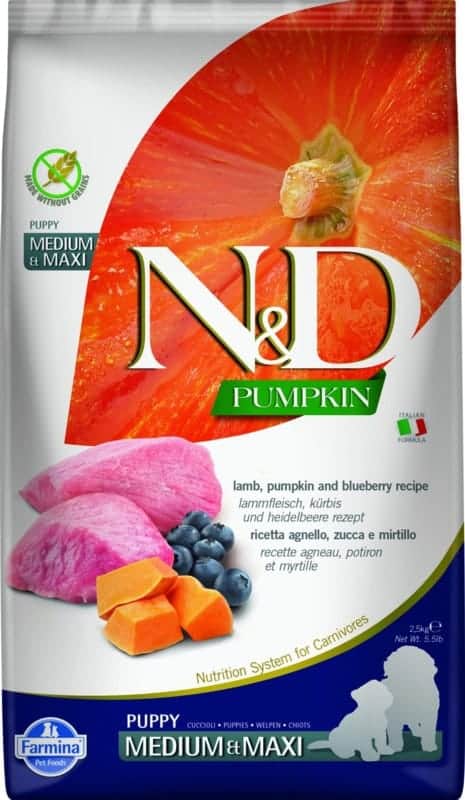 Deze puppybrok van Farmina is geschikt voor alle medium en grotere hondenrassen en is een complete voeding wat voldoet aan de voedingsbehoeften van puppy’s. De voeding is graanvrij en er is gebruik gemaakt van vers en gedroogd vlees/vis aangevuld met o.a. groenten, fruit en kurkuma. De naam Pumpkin zegt het al, er is pompoen toegevoegd als zetmeelbron. Pompoen ondersteunt het immuunsysteem, is ontstekkingsremmend en is een bron van natuurlijke antioxidanten. Bovendien heeft pompoen een lage glycemische waarde wat zorgt voor minder schommelingen in de bloedsuikers.