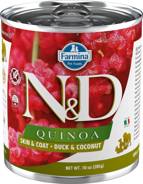 Deze blikvoeding van Farmina is op basis van eend met toevoegingen als kokos. Kokos is rijk aan essentiële mineralen als koper, ijzer, kalium en magnesium. Kokos heeft belangrijke effecten op huidherstel en is rijk aan natuurlijke antioxidanten. De blik en brokvoeding Quinoa is ontwikkeld voor volwassen honden met speciale voedingsbehoeften zoals bij intoleranties/allergieën of overgewicht. Alle varianten zijn graanvrij en met meer dan 90% eiwit van dierlijke oorsprong uit innovatieve bronnen. Er is gekozen voor o.a. Quinoa als koolhydraatbron en heeft veel voedingsvoordelen. Bevordert de spijsvertering, is een bron van waardevolle aminozuren, mineralen en antioxidanten, glutenvrij en is afkomstig van italiaanse biologische boerderijen. Bovendien heeft quinoa een lage glycemische waarde wat zorgt voor minder schommelingen in de bloedsuikers.