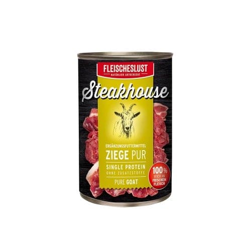 Steakhouse is een sub merk van Fleischeslust afkomstig uit Duitsland en staat voor 100% vlees (spiervlees, orgaanvlees en bot), niets meer en zeker niets minder. De producten bevatten dezelfde hoge kwaliteit vlees als de worsten van Fleischeslust, maar dan zonder toevoeging van groenten of andere niet-dierlijke producten. Daarom zijn ze ook bijzonder geschikt om in te zetten bij allergieën of in een eliminatiedieet. Deze voedingen bevatten eveneens geen toegevoegde vitaminen en mineralen en zijn daardoor enkel compleet mits voldoende afwisseling en eventueel aangevuld met groenten. De blikken van Steakhouse zijn ideaal om door brokken te mengen of om af te wisselen, maar ook als alternatief voor vers vlees tijdens vakanties.