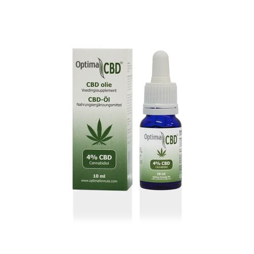 Samenstelling Optima CBD-olie 4%: Hennepzaadolie, hennepextract waarvan 400 mg cannabidiol.