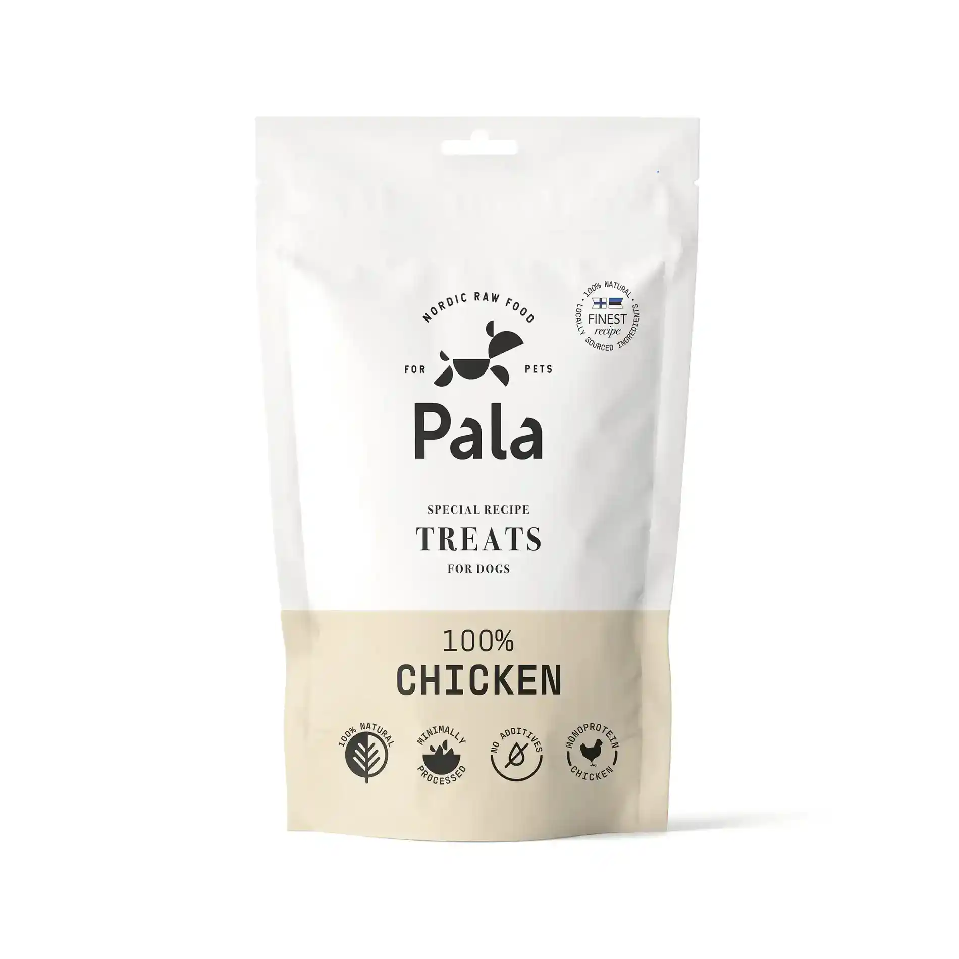 Naast de luchtgedroogde voedingen voor honden heeft Pala ook luchtgedroogde snacks in 7 verschillende varianten. Deze variant is voorzien van 100% kip. Gemakkelijk te verteren eiwit dat rijk is aan glucosamine, B-vitamines, choline, aminozuren zoals tryptofaan, ijzer, zink, selenium en gezonde omega-6-vetzuren. Doordat de snacks luchtgedroogd zijn hebben ze een zeer hoge voedingswaarde.