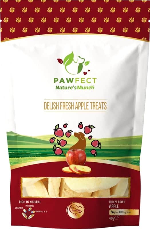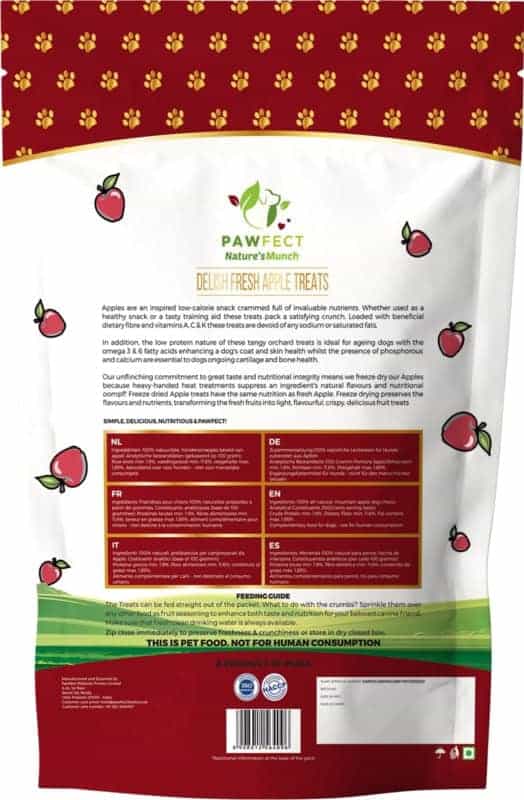 De Pawfect Nature’s Munch serie zijn heerlijk gezonden 100% fruitsnacks voor je hond. Appels zijn een fantastisch caloriearm tussendoortje boordevol waardevolle voedingsstoffen, waardoor ze een uitstekende keuze zijn als tussendoortje of trainingsbeloning. Terwijl onze hondjes smullen van de appel treats krijgen ze tegelijkertijd de voordelen van veel vitamines en mineralen. Naast rijke hoeveelheden voedingsvezels vitamine A, C en K bevatten deze hondensnacks geen natrium en verzadigd vet. Het extreem lage eiwitgehalte maakt deze hondensnacks een goede keuze voor honden die een restrictief dieet hebben dat geen hoog eiwit- en vetgehalte toestaat. Dit is vooral handig voor oudere honden of honden met bepaalde ziekten. De omega 3- en 6-vetzuren verbeteren de vacht- en huidgezondheid, terwijl fosfor en calcium aanzienlijk bijdragen aan de gezondheid van kraakbeen en botten.