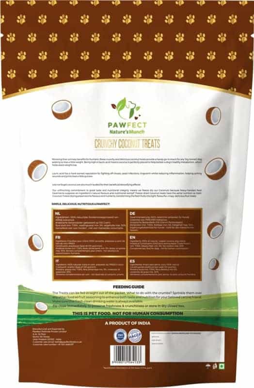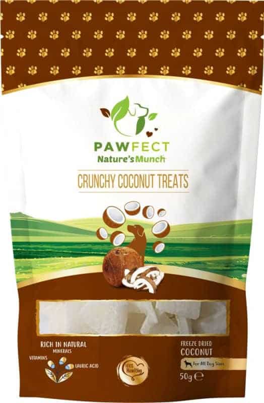 De Pawfect Nature’s Munch serie zijn heerlijk gezonden 100% fruitsnacks voor je hond. Kokosnoot bevat veel laurinezuur, waarvan het lichaam hele moleculen kan opnemen door ze als directe energiebron te gebruiken. Deze gezonde triglyceriden met middellange ketens in de kokosnoot helpen het metabolisme van onze hond te stimuleren, wat leidt tot gewichtsverlies en gewichtsbeheersing. Het laurinezuur in kokosnoten is bijzonder goed in het bestrijden van virussen, schimmelinfecties, ringwormen en het verminderen van ontstekingen. Het voeren van de kokossnoepjes aan je hond kan niet alleen zijn smaakpapillen verrukken, maar ook zijn pijnlijke wonden en gewrichten een beetje beter laten voelen.