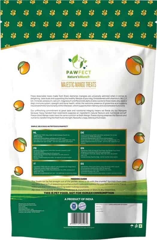 De Pawfect Nature’s Munch serie zijn heerlijk gezonden 100% fruitsnacks voor je hond. Behalve dat ze heerlijk zijn, zijn mango’s een uitstekende bron van vitamine C, A, B6 E en K. Rijk aan de essentiële mineralen kalium, magnesium, calcium, evenals natuurlijk voorkomende botanische samengestelde flavonoïden alfa-caroteen en bèta-caroteen. De Pawfect Natures Munch mango hebben een positieve invloed op de botten, het gezichtsvermogen en het immuunsysteem van je hond. Mango bevat essentiële vitamine B6, samen met glutaminezuur. Deze voedingsstoffen helpen de neurotransmitterfunctie in de hersenen te verbeteren, wat op zijn beurt helpt om het geheugen en de concentratie van je hond te verbeteren.