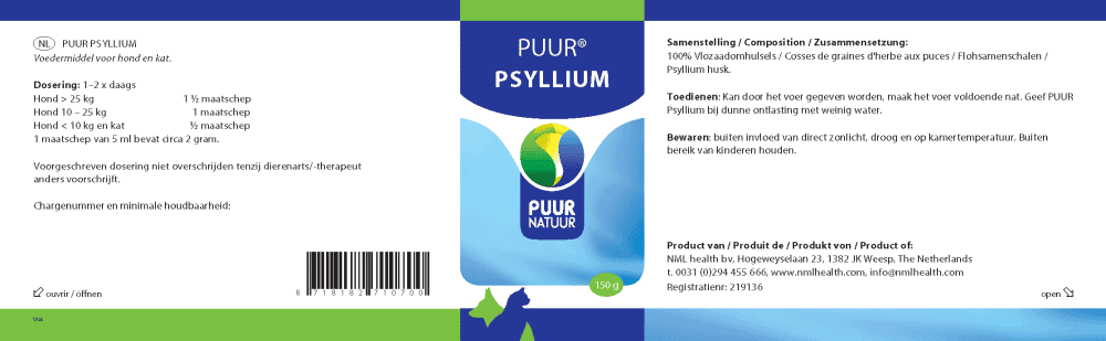 Puur psyllium kun je inzetten bij zowel diarree of verstopping bij je hond, bij verstopping geef het het met extra water. Psyllium wordt gezien als een van de beste vezels, mede ook omdat ze heel veel vocht kunnen opnemen. Psyllium zorgt voor een zachtere darminhoud bij bijvoorbeeld obstipatie bij je hond wanneer je met water of extra nat voer geeft. Bij dunne ontlasting kun je het rechtstreeks over de voeding geven, dan dikt het de ontlasting in.