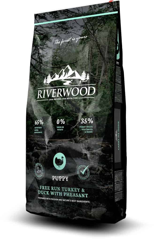 Deze graan-/glutenvrije brokken van Riverwood zijn geschikt voor pups van alle rassen met een volwassen gewicht tot 25 kilo. Voorzien van vrije uitloop kalkoen, eend & fazant aangevuld met groenten, fruit, spirulina en kurkuma.Bevat deze voeding alle noodzakelijke bouwstoffen voor een gezonde groei van puppy’s van 1 tot 12 maanden. In de Riverwood puppy is bewust gekozen voor de extra toevoeging van sprirulina en teunisbloemolie voor de ontwikkeling van de cognitieve functies.