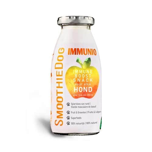 Drinkt uw hond te weinig? SmoothieDog is de verfrissende drinkpauze voor elke hond. Deze onweerstaanbare hondensmoothie met rundvlees (alleen spiervlees), groenten, fruit, kruiden en superfoods is een garantie voor de aanvoer van vocht in elke dagelijkse situatie. Deze variant van SmoothieDog, Immunio, ondersteunt op natuurlijke wijze het immuunsysteem van een hond met speciale ingrediënten. Rundvlees is ideaal als immuunboost, rode biet is een van de meest verteerbare groenten voor honden en voorziet het immuunsysteem van waardevolle vitamines en mineralen. Verse appels en sappige frambozen maken deze hondensmoothie heerlijk verfrissend voor elke hond. De drievoudige combinatie van de superfoods kokos, kurkuma en rozenbottel hebben een antibacteriële werking en zorgen voor een echte immuun kick. Het vitamine C-gehalte van rozenbottel is twee keer zo hoog als dat van citrusvruchten. De drie superfoods voorkomen ontstekingen en kunnen de genezing ondersteunen. Zonnig sint-janskruid verlicht op donkere dagen een sombere hondengeest. Goed voorbereid op natte dagen of voor en na inspanning zoals ziekte of operatie of gewoon omdat SmoothieDog Immunio zo lekker smaakt.