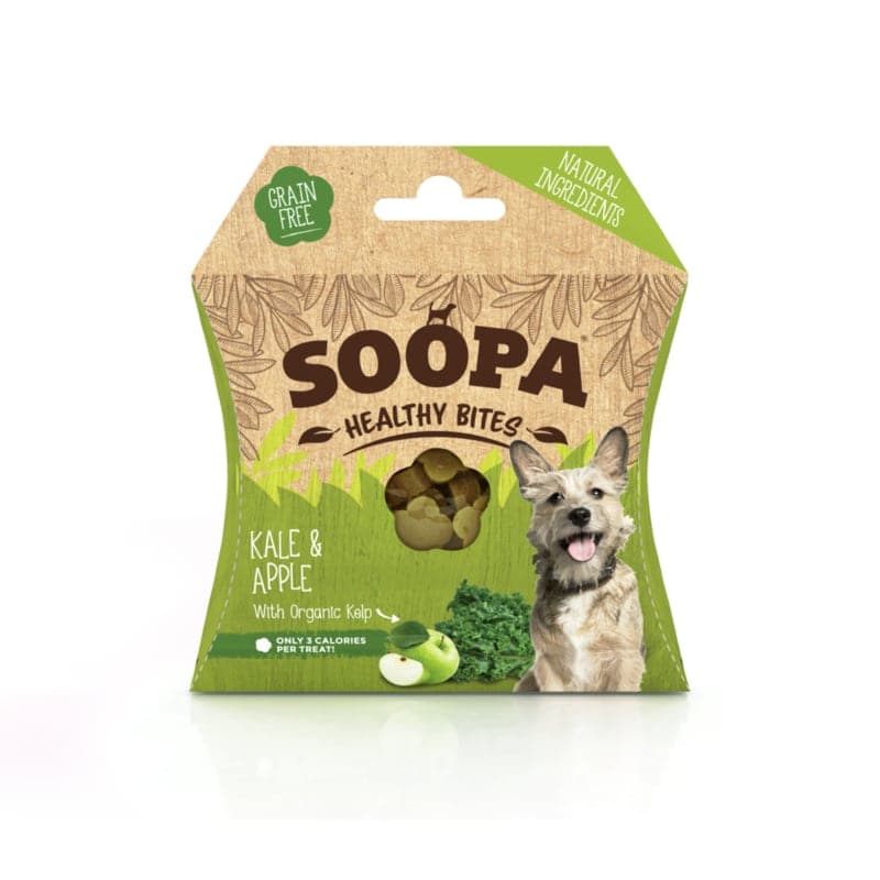 Ingrediënten: aardappelmeel, aardappelzetmeel, vegetarische glycerine, gedroogd zeewier, gedroogde boerenkool, calciumcarbonaat, appel, biologische kokosolie.