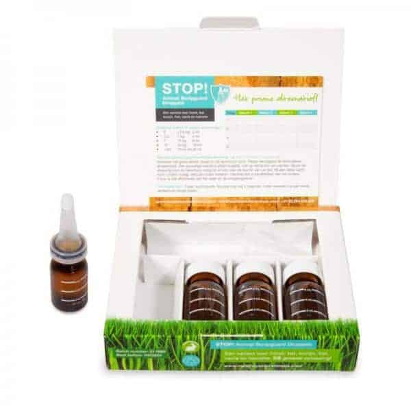 100 % natuurlijke druppels, o.a. gemaakt van essentiële oliën, hypoallergeen! De unieke plantaardige formule van STOP! Animal Bodyguard Aromatherapie is volledig veilig voor uw hond, kat, konijn, cavia, fret en hamster. Volwassenen en kinderen kunnen het huisdier onmiddellijk na toepassing aanraken. Dankzij de milde samenstelling ook geschikt voor zogende moederdieren, pups, kittens en oudere dieren. STOP! Animal Bodyguard Aromatherapie helpt de vacht gezond, jeukvrij en fris te houden. Het houdt ongenode gasten op afstand. Kan worden verdeeld over het lichaam zonder bijwerkingen. Direct zwemmen na het toepassen vermindert de werking niet!
