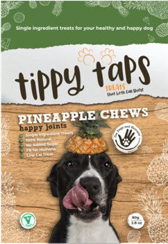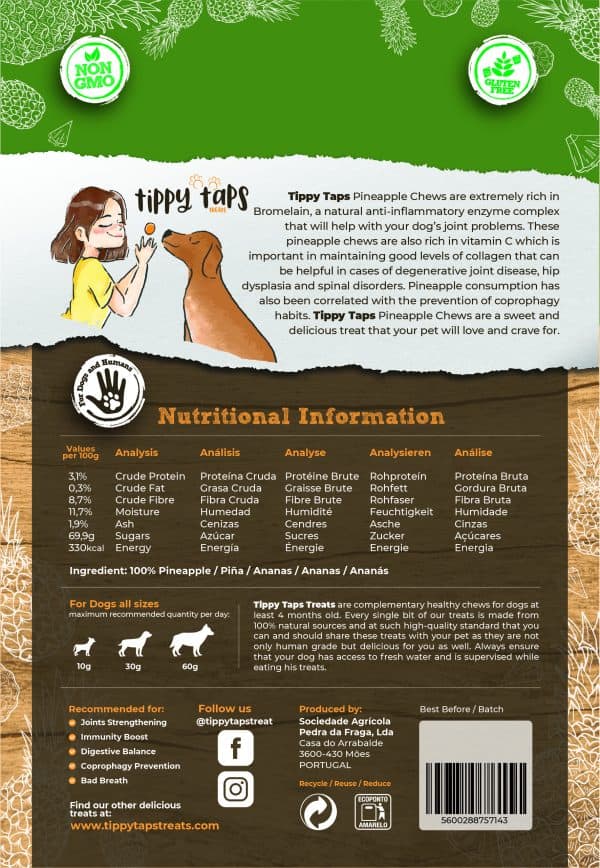 Deze Tippy Taps ananas snacks zijn een verantwoorde gezonde snack voor je hond. Gemaakt van 100% gedroogde ananas zonder kunstmatige toevoegingen. Ananassen zijn extreem rijk aan bromelaïne, een natuurlijk ontstekingsremmend enzymcomplex dat zal helpen bij de gewrichtsproblemen van uw hond. Ze zijn ook rijk aan vitamine C, wat belangrijk is voor het behoud van een goed collageengehalte, wat nuttig kan zijn bij degeneratieve gewrichtsaandoeningen, heupdysplasie en aandoeningen van de wervelkolom.