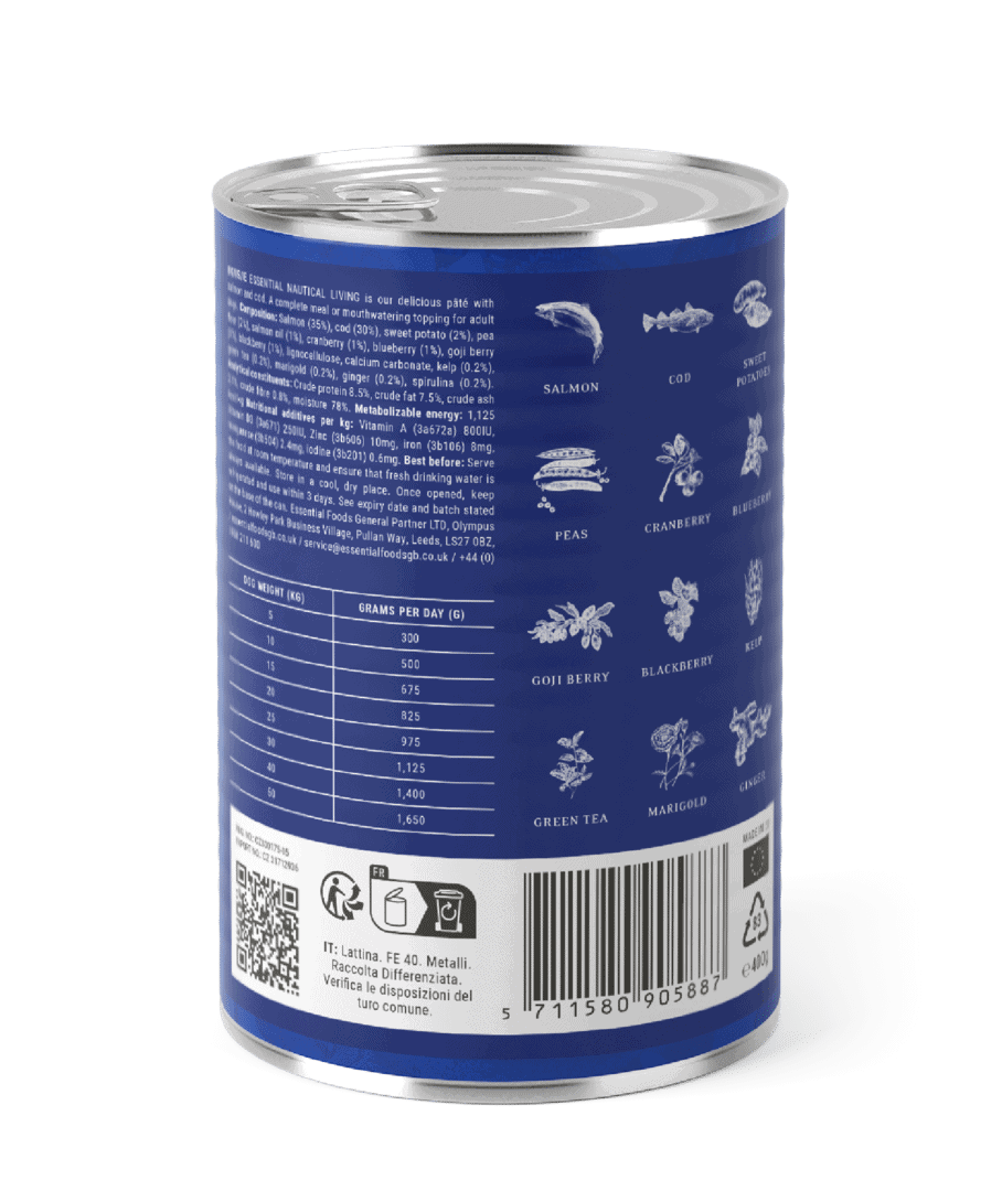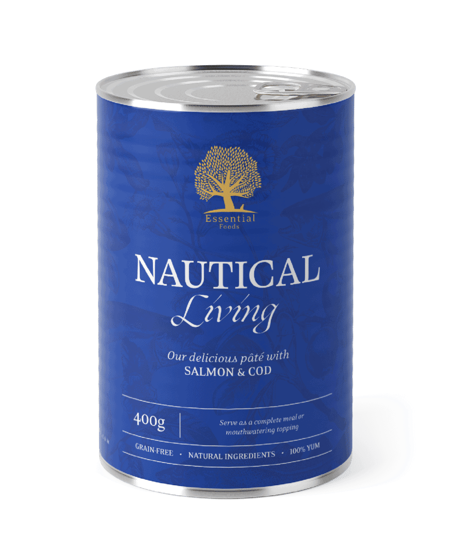 Essential Foods Nautical Living blikvoeding is een heerlijke paté met zalm en kabeljauw voor volwassen honden. Het kan worden geserveerd als een complete maaltijd, maar smaakt net zo goed als een overheerlijke topping over de brokken. Het is graanvrij, uitsluitend op basis van vis en gemaakt met uitsluitend natuurlijke ingrediënten. Een hit bij visliefhebbers!