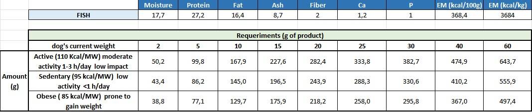 Ingrediënten: Samenstelling: 75% vers in het wild gevangen vis (25% sardientjes, 25% ansjovis, 15% makreel, 10%zeebrasem), 20% zoete aardappel, 3% gezondheidsmix: ( banaan (5982mg/kg), artisjok, cichorei, luzerne, appels (2393 mg/kg), pompoen, veenbessen (1795 mg/kg), groenlipmossel (1496 mg/kg), groene thee(1196 mg/kg), rozemarijn (897 mg/kg), tijm (748 mg/kg), origan (449mg/kg), mariadistel, spirulina, olijfolie, yucca, cordyceps (179 mg/kg),shitake, paardenbloem, gember, kurkuma), 1% forelolie, glucosamine(1000 mg/kg), chondroïtine (850 mg/kg), msm (650 mg/kg).